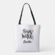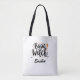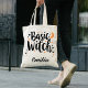 Modern Halloween custom tote bag design features "Basic Witch" text in black calligraphy-style typography. Makes for the best personalised Halloween gift for her - your friend, girlfriend, sister or even your neighbour! Perfect to make them feel special, boo