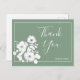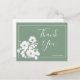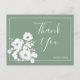 Pretty wedding thank you postcard features white floral bouquet on basil green background with white customisable text blocks in modern fonts