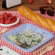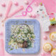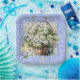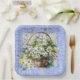 A Square Paper Plate Designed With A Basket Of White Daisy Flowers On A Blue Linen Style Background For Any Type Of Party Celebration