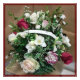 Arrangement with Freesia, Aster, Cerise pink Rosas, Eustoma russellianum, white Dianthus caryophyllus, Pittosporum tenuifolium 'Silver Queen', Eucalyptus parvifolia, Ruscus hypophyllum, Rumohra adiantiformis.