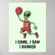 Elevate your space with our fun and energetic poster featuring a cool alien poised to make an epic shot. This design shows an alien confidently lifting a basketball, ready to dunk, with the phrase "I Came, I Saw, I Dunked" adding a touch of humour and cosmic flair. Perfect for basketball fans and lovers of quirky art, this poster brings a unique intergalactic twist to your wall decor.