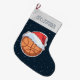 Basketball Ball Red Santa Hat Name Large Christmas Stocking. The design has a basketball ball with a red Santa hat on a dark blue background with white snowflakes. Personalize with your name.