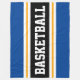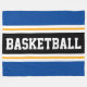 This sporty design features bold BASKETBALL text inside a wide black horizontal centre racing stripe highlighted with twin floating white pinstripes against deep blue outer stripes. The text can be personalised.
