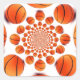 The artwork features a central point from which numerous basketballs radiate outwards in a spiralling, kaleidoscopic pattern. The basketballs vary in size, creating a sense of depth and perspective. The iconic orange colour with black curved lines representing the ball's seams are consistently depicted across all the basketballs. Some larger basketballs are positioned around the periphery of the design, framing the central kaleidoscope. The background is a clean white, ensuring the focus remains entirely on the basketballs and the dynamic pattern they form.