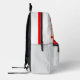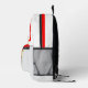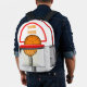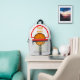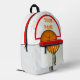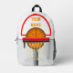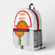 A basketball hoop featuring a white backboard with inset red border, red rim, tan net, and grey pole, and an orange basketball swishing into the front pocket. Add your name or leave it blank!
