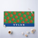 Personalise bold white name on blue stripe with basketball pattern on green.