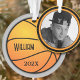 Photo template basketball Christmas tree ornament. Big orange basketball image with two lines of custom text for name and year date. Add the photo of a boy or girl to the back. This ornament is acrylic. We have one with this design in ceramic also.