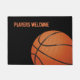 Home welcome mat with a basketball theme designed with a large basketball in the background and the words Players Welcome in a grunge style typography design with black backdrop that makes it all pop. Created for sports fans, basketball fanatics, or put this in front of your locker room.