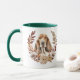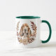 A pretty autumn wreath in tones of cinnamon brown, tan, and cream surround the watercolor image of a soulful Basset Hound Dog. The image is printed twice on the mug, with your custom text between them.