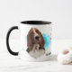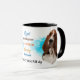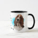 A portrait of a soulful Basset Hound Dog is the feature on two sides of this mug. Each image is placed on a bright blue spatter background. Between the two images is the text that describes this loyal and loving companion, with "the BASSET HOUND dog" in black at the bottom. All the text is easily customised to anything you'd like so that you may describe your own loyal friend.