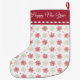 This Christmas stocking features an image of an adorable Basset Hound puppy wearing a red and white Santa Hat. At the top is a matching red border with a white diamond shape liner. "Merry Christmas" is in white script at the top. You may easily customise or remove the name at the toe of the stocking. The back of the stocking has a pretty snowflake pattern and text field that currently says "Happy New Year". It's easy to change any of the text.