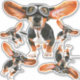 This item has 5 assorted size images of a funny looking basset hound with flying ears and pilot's goggles sheets ranging from 3"x 3" up to 14" x 14" so the stickers will range from small to very large depending on the size you choose.