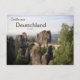 Postcard of the stone Bastei Bridge (Basteibrücke) over the Elbe river connecting the iconic rock formations of the Elbe Sandstone Mountains near Dresden in the national park Saxon Switzerland (Sächsische Schweiz) in east Germany with the text: 'Grüße aus Deutschland'.