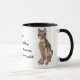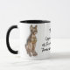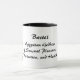 White and black 11 oz. ringer combo mug with an image, on both sides, of a brass statue of the Ancient Egyptian Goddess Bastet, and a Goddess description in the centre.