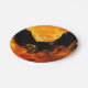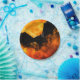 A black bat, flying through a swirly black fog, against an orange and gold harvest moon.