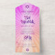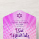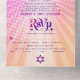 Be proud, rejoice and showcase this milestone of your favourite Bat Mitzvah with this fun boho retro, custom all-in-one invitation for an event to remember. Hip, groovy, bold dark hot pink and purple typography with modern sans serif typography overlay a background of pop light orange and pink ombre gradient rays with white dots. This all-in-one product is an unique combination of a custom invitation, including an evening venue, with an easy to tear off perforated RSVP postcard. Personalise the custom text with your Bat Mitzvah’s name, date, and venue information. Matching and coordinating address labels, stickers, banners, place cards, table numbers, table confetti, thank you notes, albums, and other Bat Mitzvah goodies are also available in this trendy and special collection. Guaranteed to add stylish fun to her special occasion!