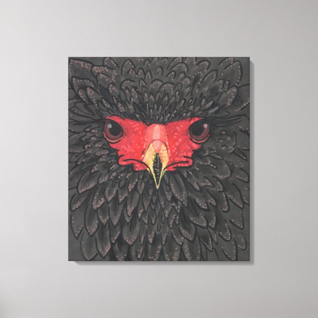 Canvas print features portrait of exotic African bird - Bateleur Eagle, black bird with red skin mask and yellow beak.. These scavenger birds are living in savannas and woodlands from Sahara to South Africa. Tissue paper collage, watercolor and acrylic markers sketch on black paper, 2021