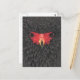 Postcard featuring portrait of exotic African bird - Bateleur Eagle, black bird with red skin mask and yellow beak.. These scavenger birds are living in savannas and woodlands from Sahara to South Africa. Tissue paper collage, watercolor and acrylic markers sketch on black paper, 2021