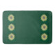 Crochet pattern of daisy in yellows, grey and hunter green. Pattern is repeated vertically 3 times each side.