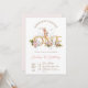 Simple but sweet bunny themed first birthday invitation featuring a cute bunny in a bath tub, some greenery, pink flowers and a bunny in a bathtub.