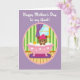 This greeting card features a sweet digital illustration inside a scalloped oval frame on a soft lavender background. In the center, a cute brown, human-like little creature with rounded ears and deep dark eyes peeks up from a pink bathtub dotted with lighter spots, wearing a cozy pink knit cap as if enjoying a gentle, friendly moment ❤️. Fluffy bubbles rise around it, and a small yellow bath toy floats nearby, adding a light, affectionate touch. Behind the tub, the bathroom wall is filled with vertical lime and pale green stripes, giving the scene a cheerful, cozy setting. A window with rich purple curtains opens to a bright view, while a warm wood floor sits below to ground the pastel scene. Near the top of the design, a short message appears in white lettering, centered above the oval image and standing out clearly against the lavender space. Tiny white sparkles and a small golden star twinkle among the bubbles 🌼.