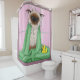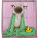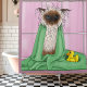 A siamese cat is soaking wet from having a bath. The cat has a green towel around them and their rubber ducky in a backdrop of pink bath tiles. The cat is not happy about the bath..