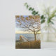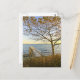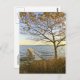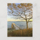 Customise this postcard! A private pier and a late autumn tree are bathed in golden light, against a light blue sky. In the horizon, the colours of sunset illuminate the small islands in the far horizon. Photography by Minerva Bloom.