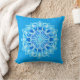 Throw pillow in a batik textured mandala / medallion pattern in shades of aqua, turquoise and cobalt blue on a turquoise background