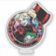 This card suit style circular emblem features Harley Quinn winking back over her shoulder while holding a large mallet.