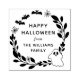 Cute Halloween stamp for your Halloween gifts and Halloween favours with Happy Halloween from your family written inside a wreath of greenery, a ghost, and cute bats.