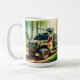 The image shows a robust, camouflaged military vehicle stationed in a bright, lush jungle setting. The vehicle's body is painted in green, brown, and tan camouflage patterns, designed to blend with its surroundings. Its large, rugged tires are built to tackle rough and uneven terrain, and its frame is reinforced with armoured plating. A mounted gun turret is positioned on top, ready for combat, and a net cover drapes over the rear compartment, providing additional concealment. The front of the vehicle features a bold, red star, adding a distinctive touch to its design. Sunlight filters through the canopy above, casting a warm, dappled glow across the scene, highlighting the rugged details of the vehicle while the dense green foliage surrounds it, emphasising the military car’s preparedness for battle in a challenging jungle environment.
