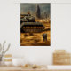 Battle field out side the city of Novum Desertum, a tank driver away and a small mech walking away a city in the background and a dusty sky over the city. This is a AI generated art.