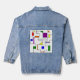 This denim jacket has a Bauhaus design of lines going vertically and horizontally to make a grid with squares, rectangles, triangles, and circles placed around the grid. If you like the design but prefer different colours, message me.