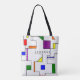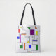 This tote bag has a Bauhaus design of lines going vertically and horizontally to make a grid with squares, rectangles, triangles, and circles placed around the grid. If you like the design but prefer different colours, message me.