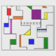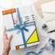 This wrapping paper has a Bauhaus design of lines going vertically and horizontally to make a grid with squares, rectangles, triangles, and circles placed around the grid. If you like the design but prefer different colours, message me.