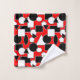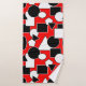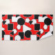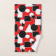 This towel set has a Bauhaus design of triangles, circles, rectangles, and pentagons in black and white on a field of red.