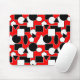This mouse pad has a Bauhaus design of triangles, circles, rectangles, and pentagons in black and white on a field of red.