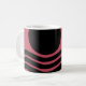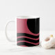 This mug has Bauhaus design of wavy lines and circles in black on a field of deep pink.