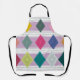This apron has a Bauhaus design of diamonds on purple strips with a design meant to look like quilting.