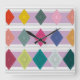 This clock has a Bauhaus design of diamonds on purple strips with a design meant to look like quilting.