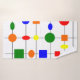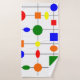 This towel set has a yellow washcloth, an orange hand towel, and a bath towel with a Bauhaus design of a grid with shapes in red, yellow, orange, green, and blue plotted on it.