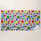 This beach towel has a Bauhaus design of a grid with squares and rectangles in red, green, blue, orange, light blue, yellow, and red.