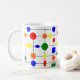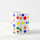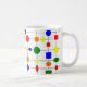 This mug has a Bauhaus design of a grid with shapes in red, yellow, orange, green, and blue plotted on it.