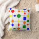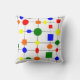 This throw pillow has a Bauhaus design of a grid with shapes in red, yellow, orange, green, and blue plotted on it.