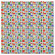 This fabric has a Bauhaus design of a grid with squares and rectangles in red, green, blue, orange, light blue, yellow, and red.