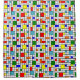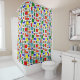 This shower curtain has a Bauhaus design of a grid with squares and rectangles in red, green, blue, orange, light blue, yellow, and red.