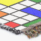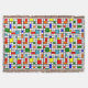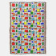 This throw blanket has a Bauhaus design of a grid with squares and rectangles in red, green, blue, orange, light blue, yellow, and red.