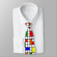 This necktie has a Bauhaus design of a grid with squares and rectangles in red, green, blue, orange, light blue, yellow, and red.