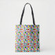 This tote bag has a Bauhaus design of a grid with squares and rectangles in red, green, blue, orange, light blue, yellow, and red.