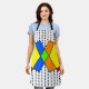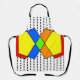 This apron has a Bauhaus design of overlapping pentagons, colored in red, yellow, orange, blue, and green with black dotted lines as a background.